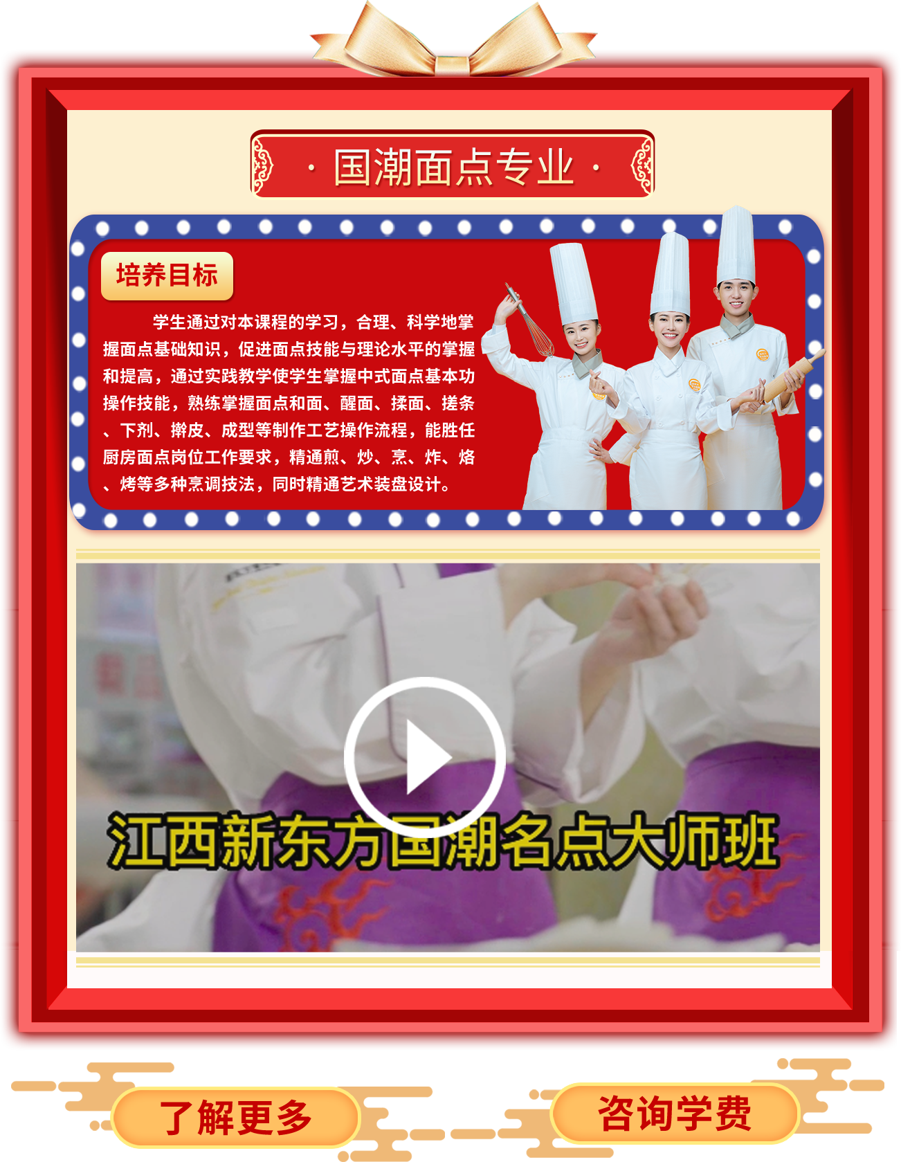 以培养集技术创新、管理能力、研发能力等全能型人才为目标,熟练掌握各类不同档次西式面点、西式烹调的制作,掌握餐饮管理、门店运营等相关知识,并具备独立创业、制品创新研发能力。