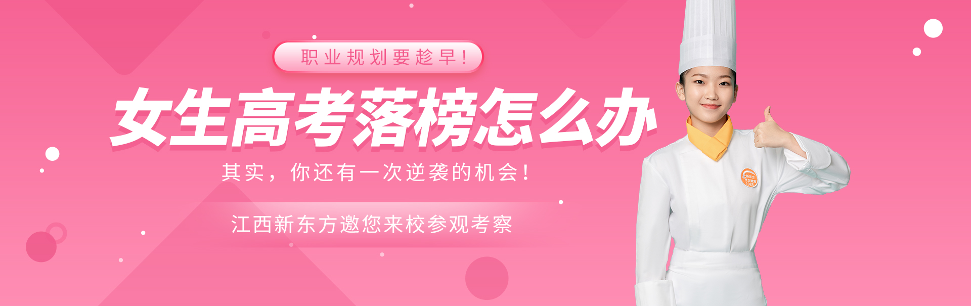 人人皆可成才,职业教育也是高考落榜的学子打开通往成功成才大门的重要途径,我国对技能人才的需求在与日俱增,职业院校学生未来前景也是一片光明。因此,江西新东方欢迎各位愿意为了未来再拼搏一次的学子,中烹/西点/西餐/高考班/酒店管理等专业,任你选择。高考落榜不可怕,抓住机会,逆袭人生,选择就在你的手中!