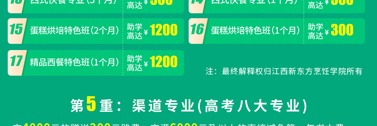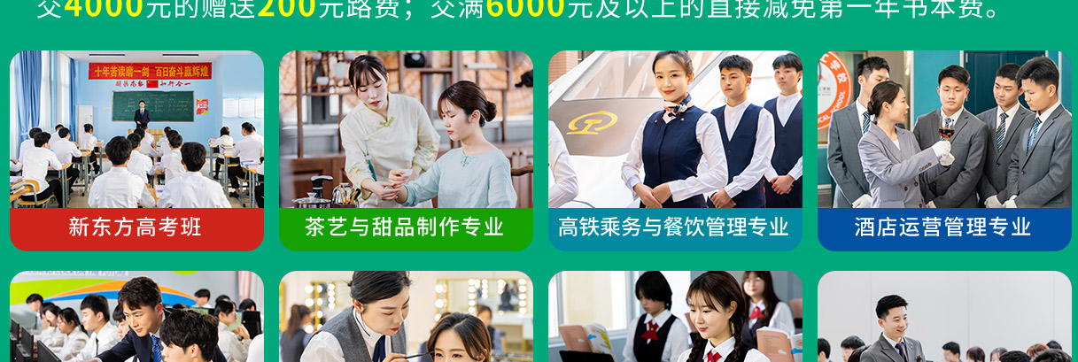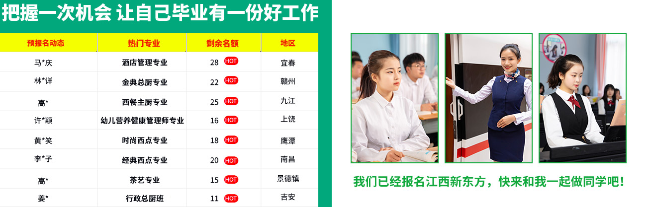 新职教法已经正式施行,国家承认职业教育是与普通教育具有同等重要地位,并且鼓励加快培养托育、美妆、家庭营养等方面技术技能人才,意味着职业教育将走向高技能、高学历、高素质的“高材生”发展道路!江西新东方为响应国家普职分类的号召,帮助初中毕业学子圆梦大学,开设多种职教高考专业,有幼师、茶艺、美妆、酒店管理以及烹饪类专业,另特别推出高考班,名师执教,人性管理,让你在新东方,另辟蹊径轻松上大学!!!
