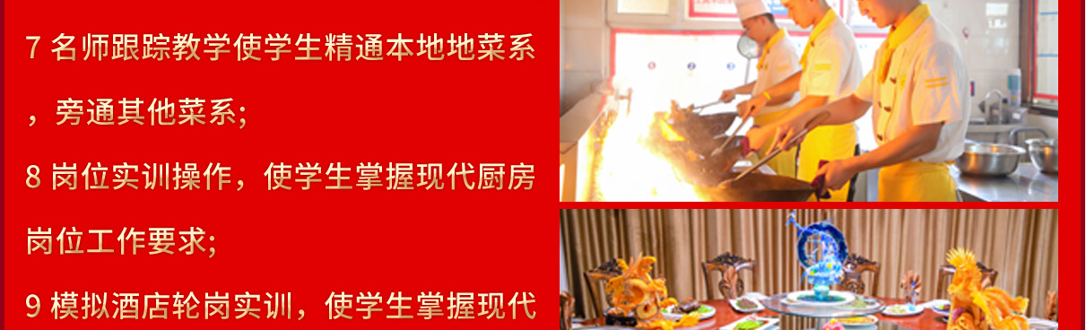培养酒店、连锁餐饮的厨师长、行政总厨为目标。使学生成为符合社会需求,善技能、懂管理的复合型人才。基本功训练,学习传统八大菜系。还包含了时尚西餐、中西式面点的制作流程。