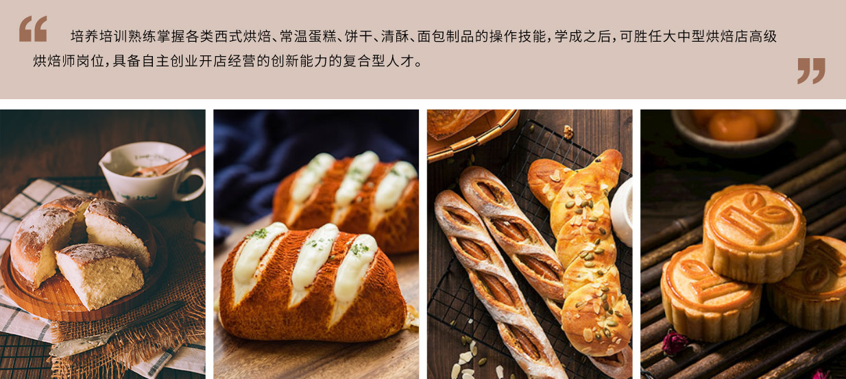 以培养集技术创新、管理能力、研发能力等全能型人才为目标,熟练掌握各类不同档次西式面点、西式烹调的制作,掌握餐饮管理、门店运营等相关知识,并具备独立创业、制品创新研发能力。