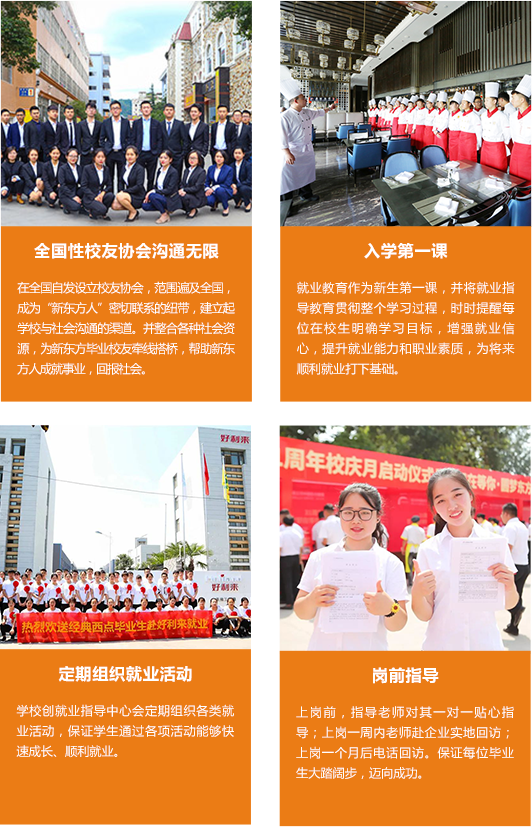 江西新东方烹饪学院一年制以上专业合格毕业生好就业,两年制以上专业推荐到名企、酒店就业,可胜任冰冠、酒楼等相关餐饮工作岗位。江西新东方烹饪学校打造五重就业保障,为学生和用人企业搭建“双赢平台,为就业提供有力保障。