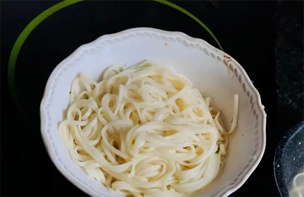 如果把煮熟的面条直接捞出碗中,放一会儿就会粘连在一起,成了一大坨,卖相差、口感差。应该把捞出来的面条放入冷水中过一道,或是直接用冷水冲一下,让面条降温,口感特别筋道;并且冲洗掉表面黏糊的淀粉糊,这样就不会粘连了,根根分明。