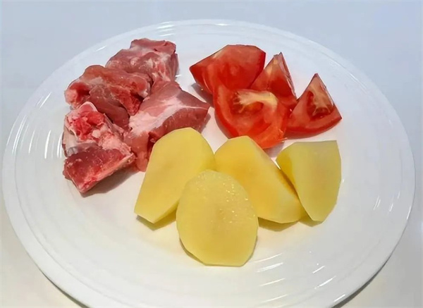 1:提前购买好新鲜猪骨,土豆和番茄,先把番茄的蒂去掉,外皮清洗干净,切成若干滚刀块,放在碗中备用。