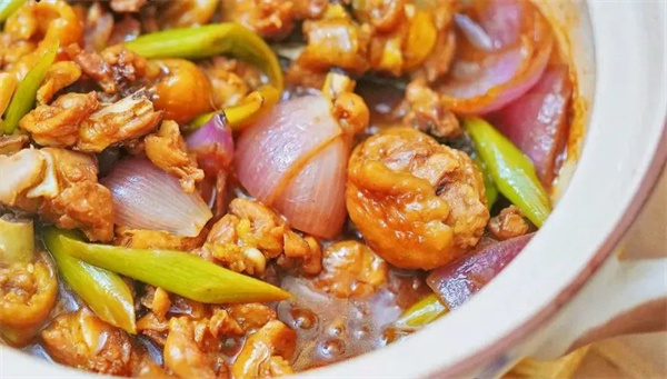 2、砂锅烧热,倒入适量油放入姜末、蒜瓣爆香,倒入洋葱块炒一会儿,炒香后铺在锅里,倒入腌好的鸡腿肉,平铺在洋葱上,蒜苗放在鸡腿上,淋入适量黄酒,没过鸡腿一半即可。