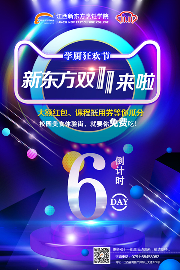 学到即是赚到,倒计时还有六天!双11远离剁手,赶紧来学厨师吧!省钱不如挣钱,遇见下一个更好的自己,就从江西新东方烹饪学校开始 !