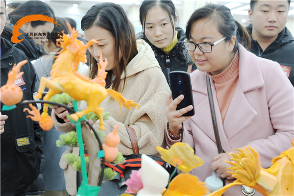 在大会现场,我院学子准备了现场食品雕刻展,引得现场群众驻足观赏,学子们炉火纯青的技艺,将烹饪的艺术,纤微毕至的展现了出来。