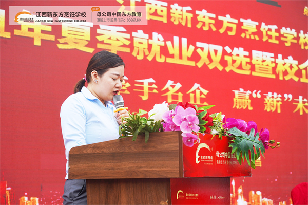 首先对莅临本次双选会的企业领导表示诚挚的欢迎与衷心的感谢。校企合作是一种注重培养素质人才、侧重学子社会实践、致力学校与企业资源共享的多赢模式!江西新东方烹饪学校一直坚持与市场接轨、与企业合作的教育理念,为职业教育带来光明的发展前景。希望同学们在本次双选会上积极与招聘企业进行沟通和交流,了解餐饮行业的用人需求,做好自己的职业规划,让人生更加出彩!