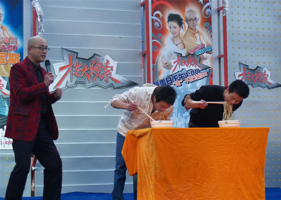 此次《才艺大搜索》的主题为“吃”,因此栏目组主动联系到素有中国烹饪教育界航母之称的江西新东方烹饪学院,邀请我院学子参与现场节目录制。录制现场定在南昌市较繁华的胜利路步行街。栏目组从全国各地搜索到“中国大嘴王”、“世界甩饼大王”、“大刀王五”等与饮食烹饪相关拥有中国之较乃至世界之较之称的奇人、能人来到现场表演,精彩的表演令我院学子瞪目结舌、大开眼界。同时主持人还积极引导我院学子与台上的表演嘉宾互动,我院学子先后参与了“大刀切面”、“印度甩饼”等现场活动,其中我院学子陈世富在现场蒙着双眼用芋头雕刻出主持人廖杰的形象,引得台上台下一片惊呼,并得到了主持人与嘉宾的一致好评。