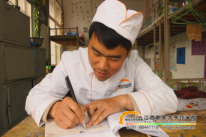 来自江西万年县的朱峰,是江西新东方烹饪学校强化(2)班的一名新生。有想法立志做一番事业,率性、认真、执着,在同学们的眼中,朱峰随和、阅历丰富。“一直有从事厨师的想法,只是少时生活的压力太大”,说到学厨师的初衷,经历在外一番打拼的朱峰认识到还是要有一门手艺傍身,才能更好的安身立命,更好的立足社会。