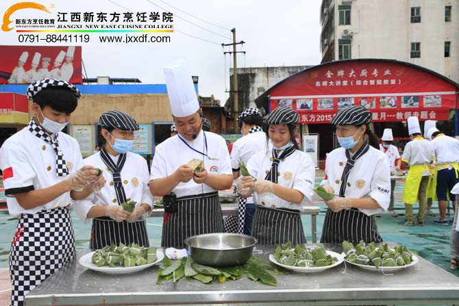 江西新东方烹饪学院的操场上人头攒动,热闹非凡,同学们秩序井然的把包粽子所需的材料准备齐全放在案板上,有翠绿鲜嫩的粽叶,有雪白的糯米,有鲜红剔透的蜜枣,有鲜美可口的火腿肉,还有“绑架”粽子的线绳,真是非富多彩极了!