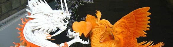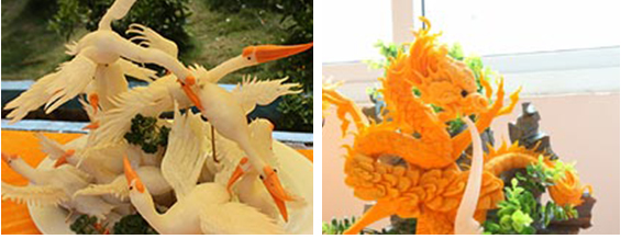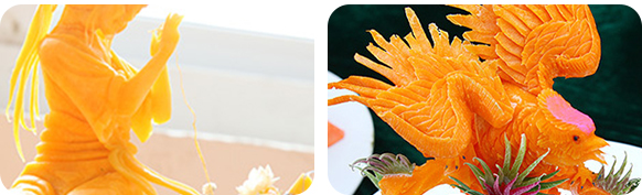 食品雕刻是用烹饪原料,雕刻成动物、人物、花卉等形态来美化菜肴、装点宴席的一种美术呈现。食品雕刻是我们美味菜肴中的一道风景线如果说美味佳肴是红花,那么它就是绿叶,食品雕刻能烘托宴席的气氛,增加人们的食欲,是美食的点缀。