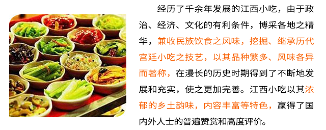地方特色小吃:白糖糕、如意糕、炒田螺、水煮、荷叶饭、艾叶粑粑、饺子粑、鱼饼、糯米子糕、婺源汽糕、铅(“言”同音)山烫粉、南瓜干、灰煎果、清明粿、羊肉粉、月亮巴、南康汤皮、吉安薄酥饼、铜鼓包圆