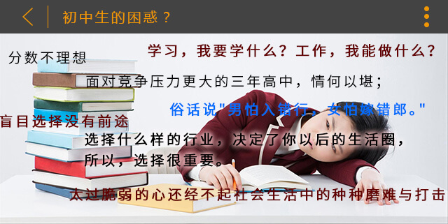 初中毕业了以后的路该怎么走?现在的媒体报道上出现“高学籍、高智商、低收入”的蚁族,在这些人诉说艰辛的求职之路时,你是否有强烈的危机感?初中生选择学技术,却又担心学不好,那么初中毕业生又应该选择学什么专业将来才好就业呢?