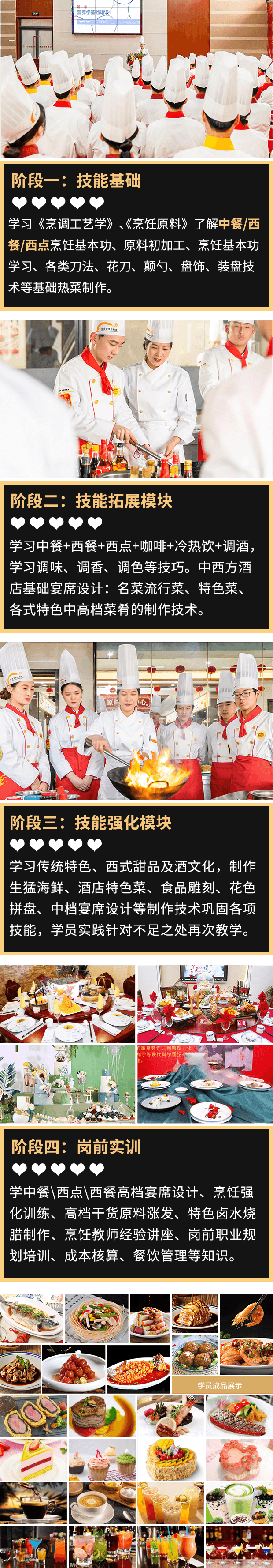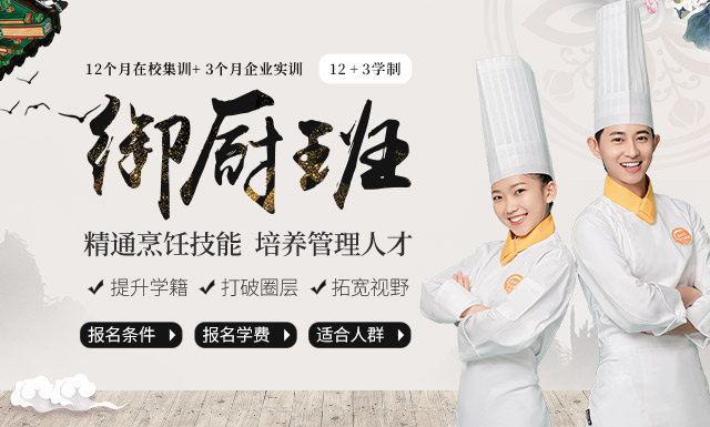 学制15个月,在校12个月(学习中餐+西餐+西点+咖啡+冷热饮+调酒),企业3个月(授课+实习),以培养行政总厨、厨师长、菜品制作总监、厨师长助理等高级烹饪人才为目标,重点培养学生的实践动手和管理能力,能胜任星级宾馆、酒店、大型酒楼、知名餐饮企业的工作需求或独立开店能力的烹饪人才。