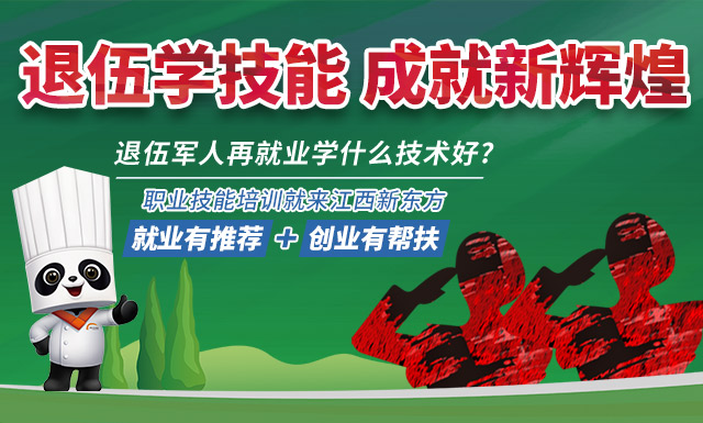 退役军人退伍不退志,江西新东方烹饪技工学校为了让广大退役军人能够 更好就业、更高质量就业。我院依据市场趋势,结合学院教学特色,为广大退伍学子量身打造了 创业短期精品专业 。预报从速!