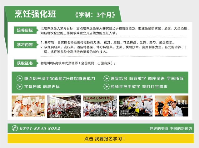 通过9个月的学习,培养行政总厨、厨师长、菜品制作总监、厨师长助理等高级烹饪人才为目标,重点培养学生的实践动手和管理能力,能胜任星级宾馆、酒店、大型酒楼、知名餐饮企业的工作需求或独立开店能力的烹饪人才。18岁以上有志青年,综合素质高,五官端正,谈吐清晰,经学校严格面试通过后方可就读。