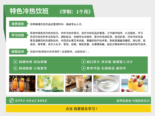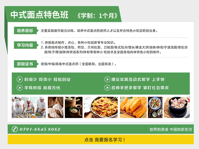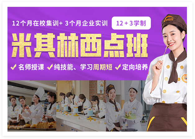 通过15个月的学习,熟练掌握西点原料及营养知识,精通西点制品制作原理,西点房经营管理等相关知识。熟练掌握西点原料及营养知识,精通西点制品制作原理,西点房经营管理等相关知识。重点培养上岗能力,精通各类经典的西点和市场流行的西点产品,能胜任设计各类不同档次的西点展台。