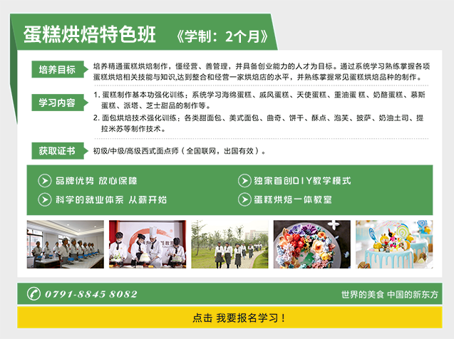 新东方国际西点班,通过9个月的学习,掌握近600个品种的制作方法、技巧和原理,达到举一反三的效果。在授课过程中详细讲解设备的选择与使用、原料性质与鉴别、成本核算、人员配备与管理、店面的布局与装潢和产品营销等,使学员可以学习不同项目的技术和管理店面的知识,就业时可以展现更全面西点烘焙技术和管理能力。