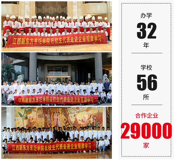 江西新东方烹饪学院,它创办于1988年,隶属于中国东方教育控股有限公司,办学32年来风雨锤炼,开创中国厨师培训新模式;多年励精图治,铸就中国烹饪教育知名品牌;多年辉煌历程,打造中国烹饪教育的航母。多次荣获“示范窗口学校”、“先进办学单位”、“诚信单位”、“文明学校”等荣誉称号。