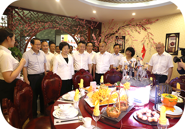 国务院副总理孙春兰(左二)参观我院中餐宴席展台,中国东方教育董事会主席兼执行董事吴伟(左三)、中国东方教育集团常务副总裁许绍兵(左一)、江西新东方烹饪学院校长曹经伟(右二)陪同。