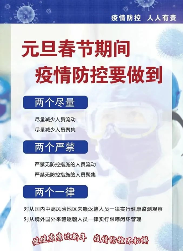 春节假期将至,高校陆续放寒假,务工人员返乡,人员流动风险急剧增加,今冬明春、春节前后是疫情防控的关键时期。根据省政府的疫情防控要求,江西省疫情防控指挥部下发的号令,为了让您的孩子度过一个安全、愉快的寒假,如期迎来新的学年,我校郑重提出建议︰家长和学生要按照“两个尽量”“两个严禁”“两个一律”的原则,即"尽量减少人员流动、尽量减少人员聚集,严禁无防控措施的人员流动、严禁无防控措施的人员聚集,对从国内中高风险地区来昌返昌人员一律实行健康监测观察、对从境外国外来昌返昌人员一律实行跟踪闭环管理”。