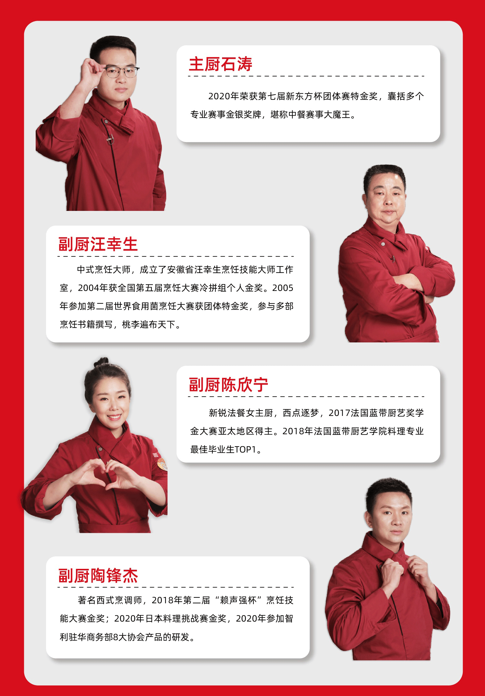 后厨有汪老师坐镇,无疑是团队的定海神针。汪老师从1987年踏入烹饪行业,至今已有三十余年,此次他甘当绿叶,他觉得石涛和陶锋杰、陈欣宁是中国烹饪承上启下的一代,需要给他们展现的机会,并带领中国厨师团队向着更高、更强发展。