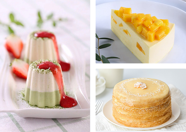 提拉米苏、歌剧院、黑森林、马卡龙两款、焦糖巧克力、黑白巧克力慕斯、蓝莓慕斯、草莓慕斯、芒果乳酪慕斯、芒果流心慕斯、樱桃乳酪慕斯、抹茶百香果、闪电泡芙