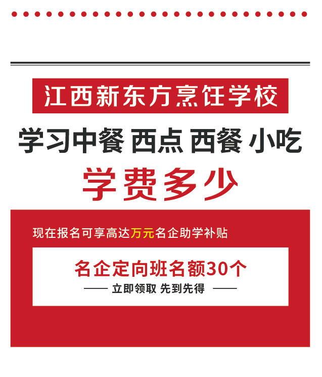 江西新东方烹饪学校是全国规模较大的烹饪教育院校,建立了全国较大、较齐全的烹饪院系,开设有以中餐、西餐、西点为主共三十余个热门专业。学校各个专业因学制、学习内容不同,学费收取各不相同。由于专业较多,因此不一一列举。