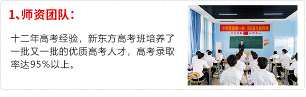 新东方高考班从2010年开始,拥有十二年高考经验,高考成绩骄人,每年的高考成功率达95%以上;学校有单独的高考教学楼,有一大批常年战斗在一线的高考老师,高考经验丰富。