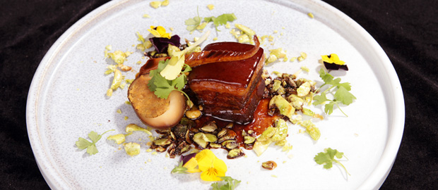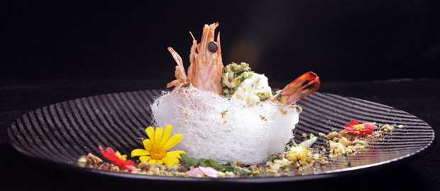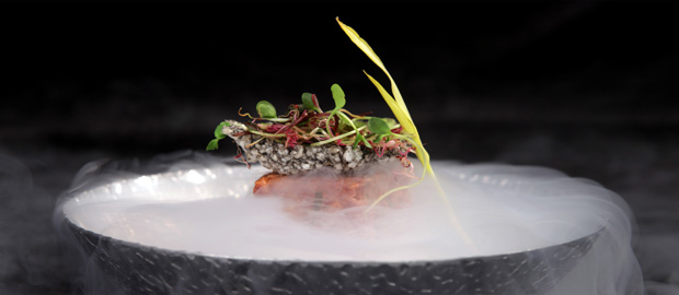 简介:这是一道典型西餐中做,传统的西餐牛肉塔塔进行了创新,用到很多中国元素。首先从味型上用到四川泡菜和野山椒调味,完全变成中国味型。另外用到分子的低温液氮制作松脆的墨鱼锅巴搭配,这样使原本只有单一口感的,松软的牛肉塔塔,加入了脆脆的口感,使口感更加丰富,层次感强。最后再在上面搭配一个素菜,而这个素菜也是利用低温冷冻的方法,不仅产生了很强的视觉效果,也给塔塔增加了丰富的口感层次,形成一个中西融合的典型菜肴。