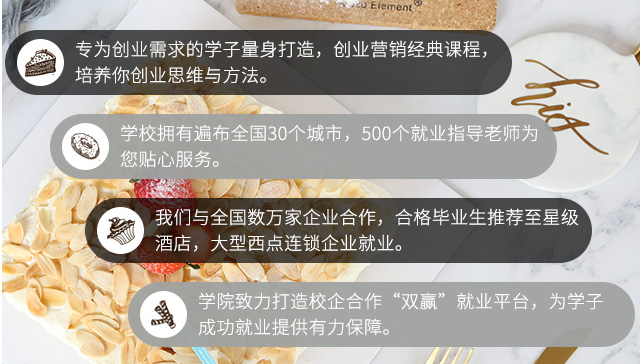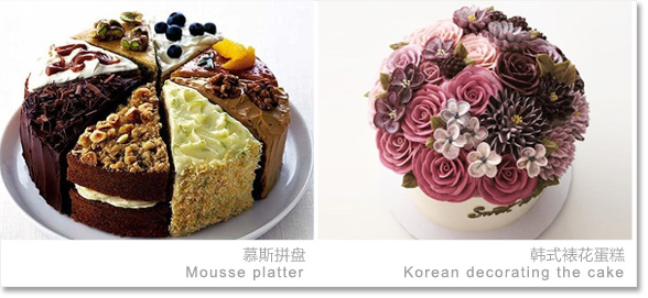第一阶段:蛋糕制作基本功强化训练、海绵蛋糕、戚风蛋糕、天使 蛋糕、重油蛋糕、奶酪蛋糕、慕斯蛋糕、派塔、芝士甜品的制作等。
