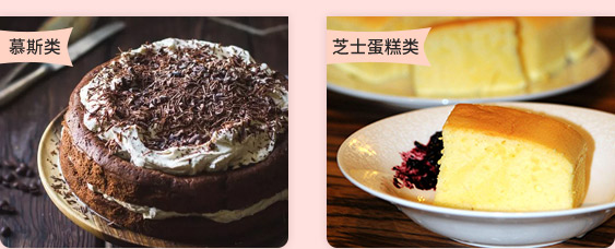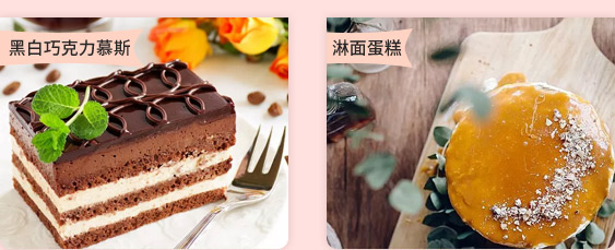 黑白巧克力慕斯(黑色喷砂)、青柠白巧克力椰子慕斯(白色喷砂)、焦糖香橙慕斯(天蓝色喷砂)、像型水果柠檬慕斯(黄色喷砂)、榛子慕斯(大红色淋面)、芒果巧克力慕斯(黑色淋面)、百香巧克力慕斯(黑色渲染)、抹茶巧克力慕斯(星空镜面)等。